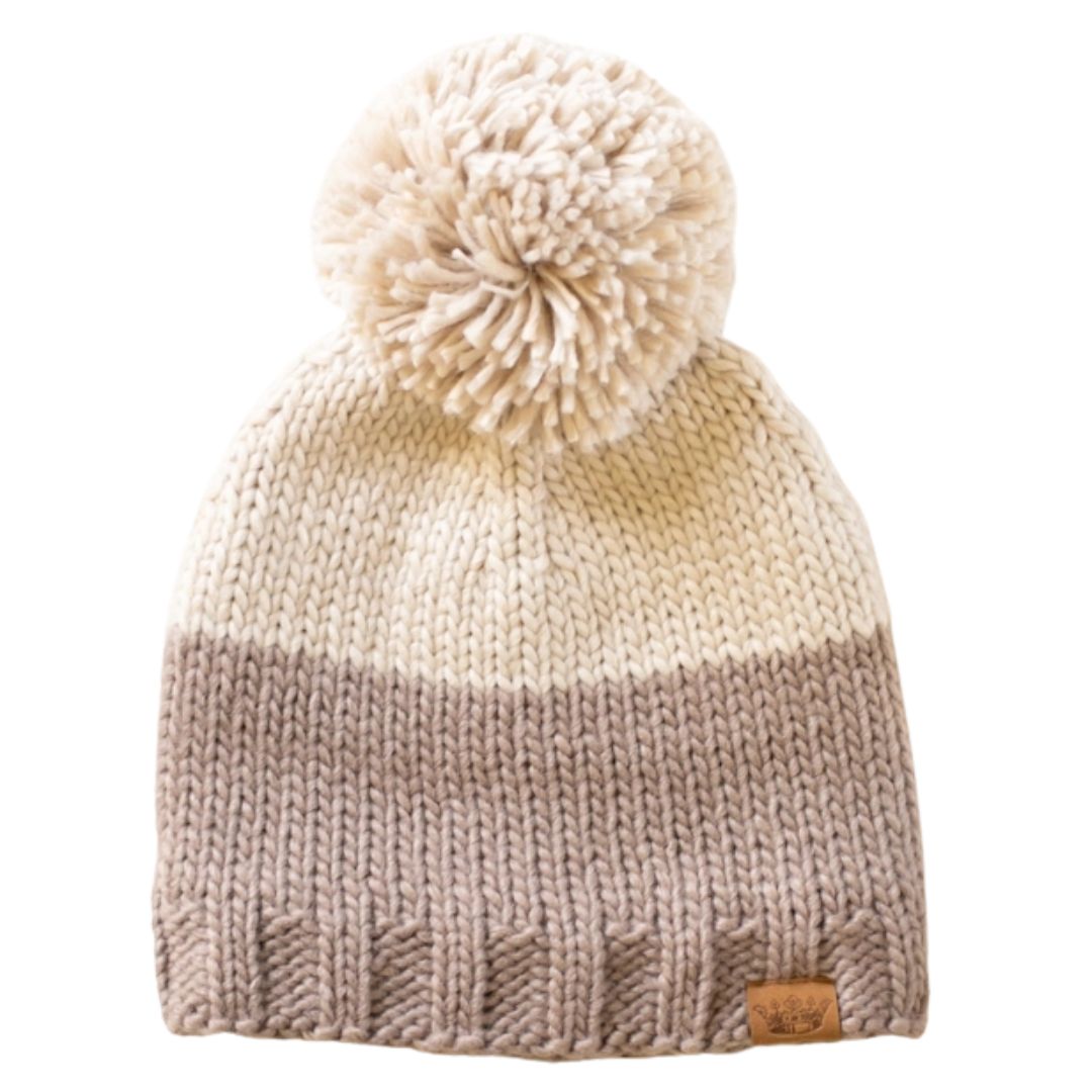 Beige & taupe color block knit hat. Large pom accent Fleece lined 100% Acrylic