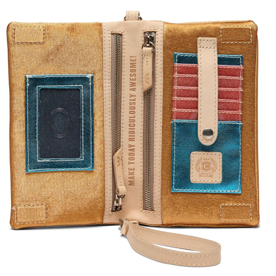 - Included detachable wristlet strap and adjustable woven crossbody strap