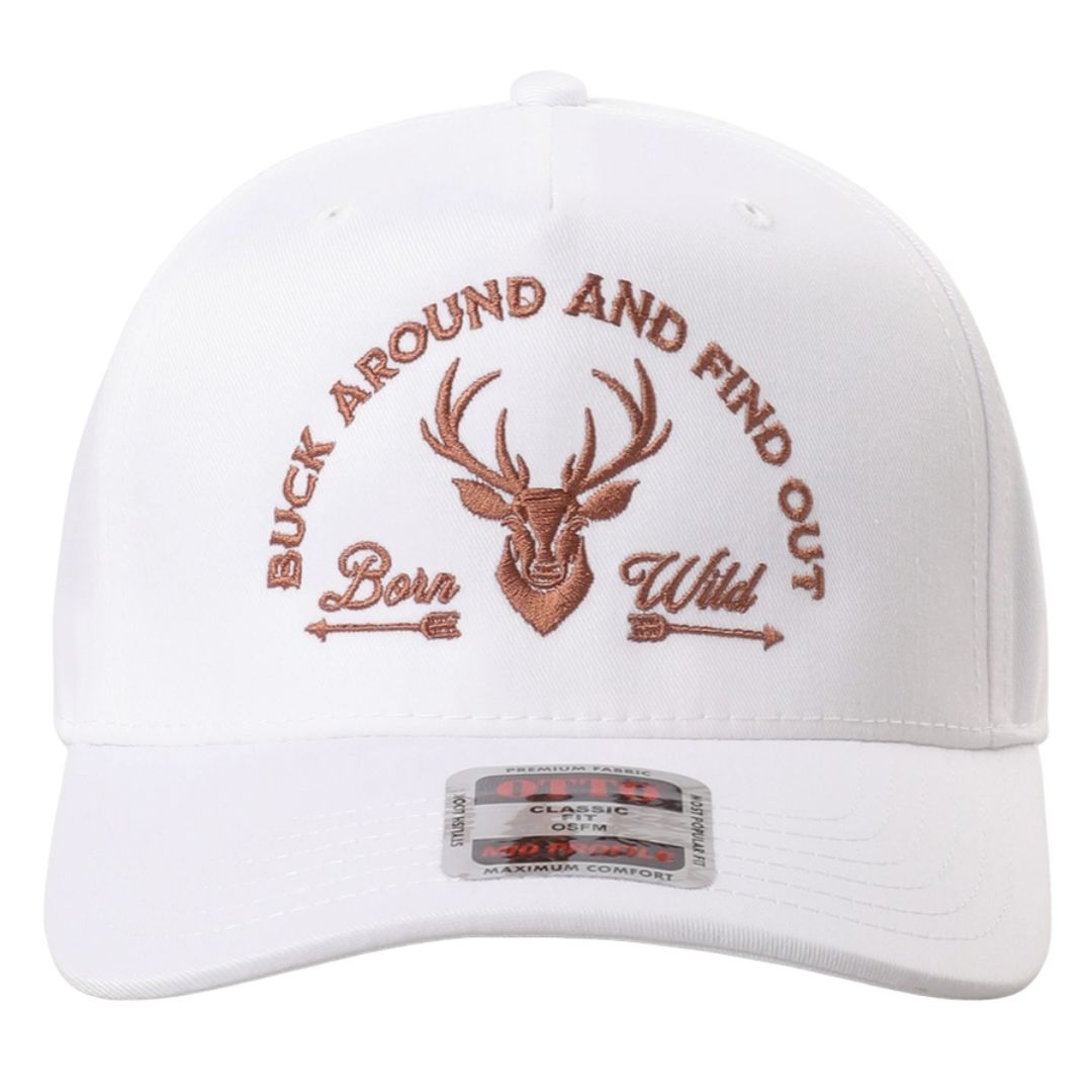Buck Around And Find Out Embroidered Trucker Hat - Buck Around And Find Out Logo Embroidery - 5 Panel Mid Profile Trucker Hat - Slight Curved - 65% Polyester / 35% Cotton - One size fits most: Adjustable snapback closure ** "BUCK AROUND AND FIND OUT – Born Wild" and a deer antler logo. This cap is a classic fit style from the OTTO brand, with a structured foam front panel that maintains its shape. The embroidery thread colors are coordinated with each cap to enhance the premium look, making these hats suitable for outdoor and lifestyle wear.
