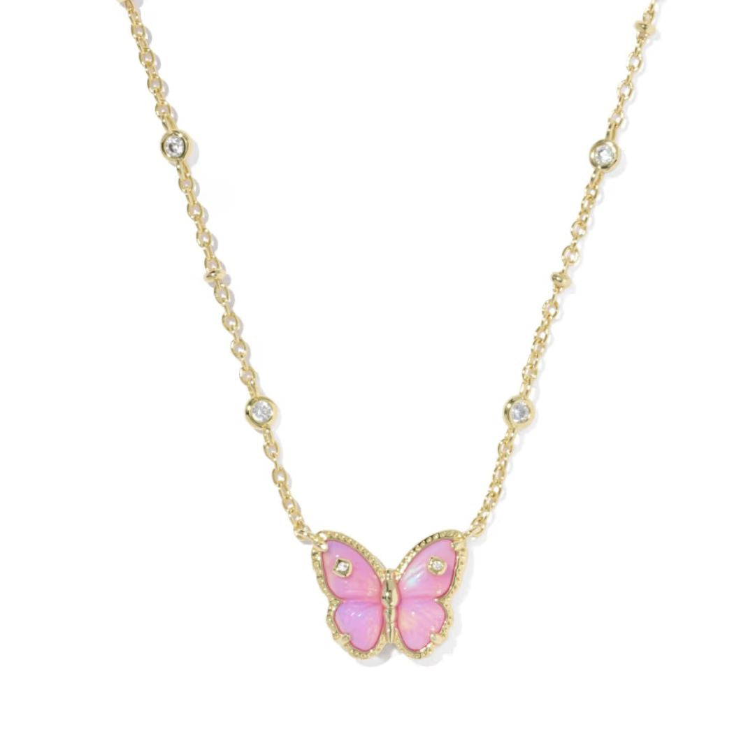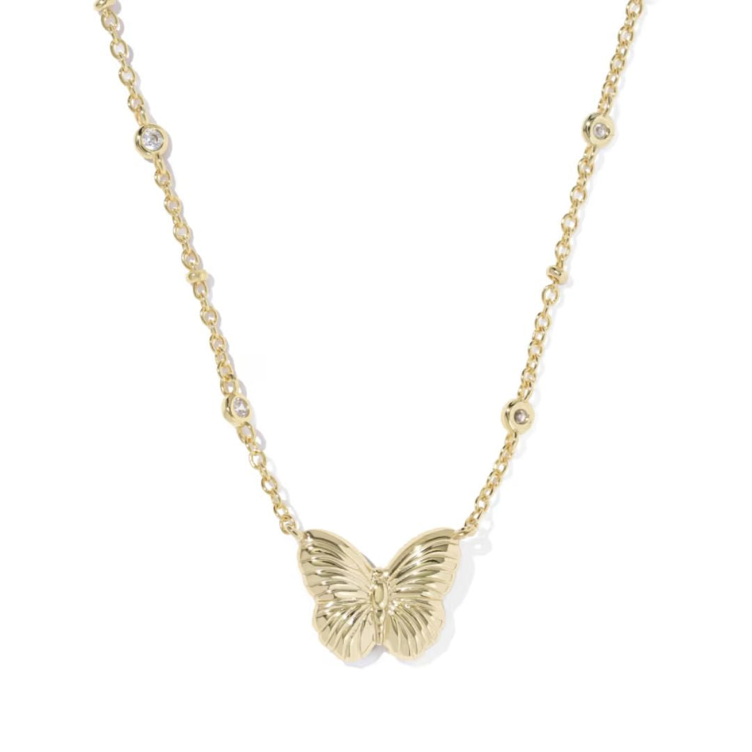 Complete with custom-carved stones to bring this beautiful motif to life, the Cailey Butterfly Gold Short Pendant Necklace will be a stunning addition to your collection. Inspired by sunlight streaming through a garden, this reversible necklace features sparkling cubic zirconia accents on a delicate chain. This classic butterfly shape is accented by metallic beauty marks for a fluttery and fabulous look.