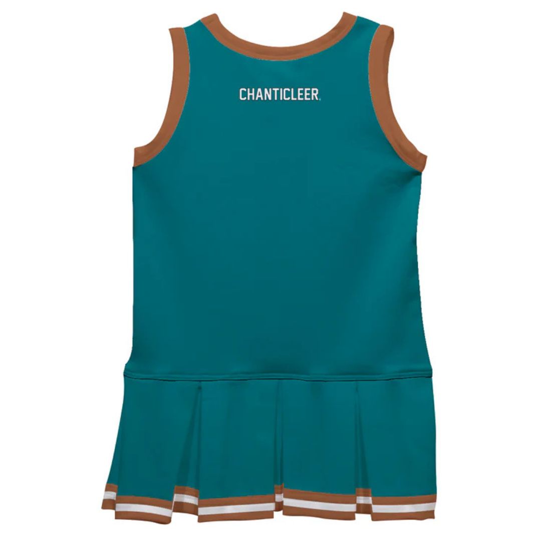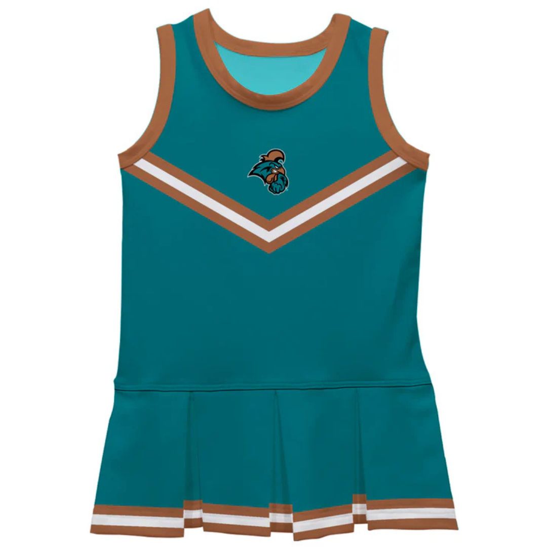 Let your daughter look cool in her new team spirit Cheer Cheerleader Dress. Let her play, enjoy the games, cheer loudly and proudly with her Coastal Carolina University Chanticleers CCU gear by Vive La Fete.Celebrate and cheer on game day with our classic design Coastal Carolina University Chanticleers CCU Green cheerleader dress with pleated skirt. Officially Licensed product sold by Vive La Fete.This awesome graphics, fun and game day cheerleader jumper features officially licensed Coastal Carolina University Chanticleers CCU colors and graphics will become an essential part of her wardrobe; perfect to cheer for her favorite team.This timeless design cheerleader dress made with top-quality long-lasting four-way stretch polyester spandex blend, sublimated moisture wicking soft knit fabric that holds its colors forever. Performance fabric that's comfy, strong, and breathable, UPF50.