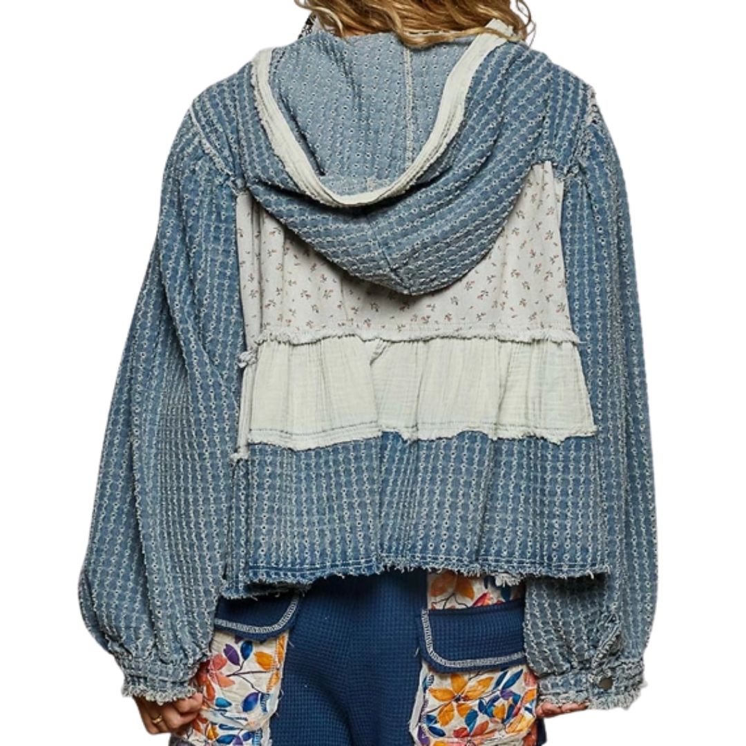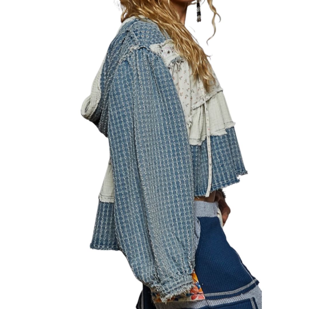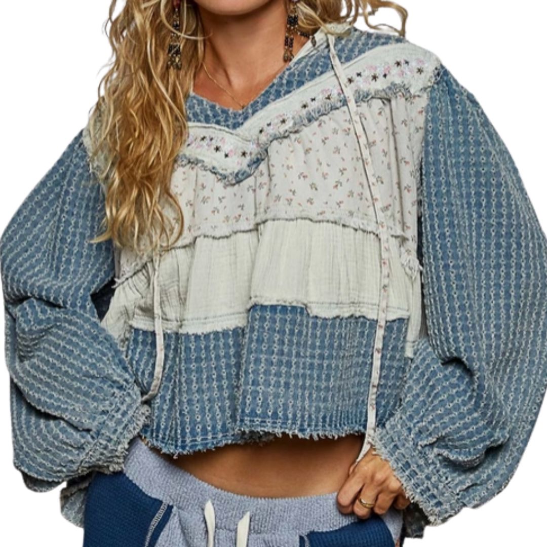 Designed in V-neck balloon sleeve regular fit hoodie top in textured denim with twill patch, double gauze ruffle and shirring, embroidery detail, outseam, raw edge, vintage washing, solid color.