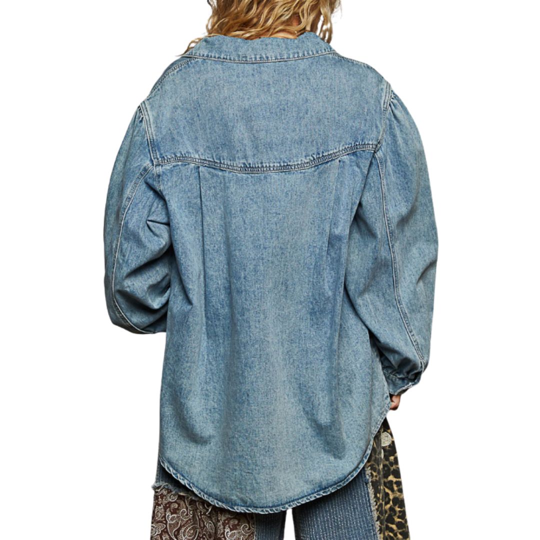 Designed in balloon sleeve roomy fit jacket in denim with stud detail.