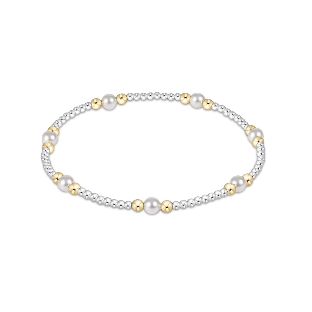 Get ready to obsess over this stunning Enewton bracelet! Featuring gorgeous 4mm crystal pearls mixed with gleaming 2mm silver and 3mm 14kt gold-filled beads, it's the perfect blend of elegance and fun. Hand-beaded on stretchy, high-performance elastic, it glides on and off your wrist with ease at a comfortable 6.25 inches. Stack it with your other favorites for a personalized look that's uniquely you. Just show those crystal pearls some love by keeping them away from water and chemicals to keep them looking fresh. Pure joy on your wrist!