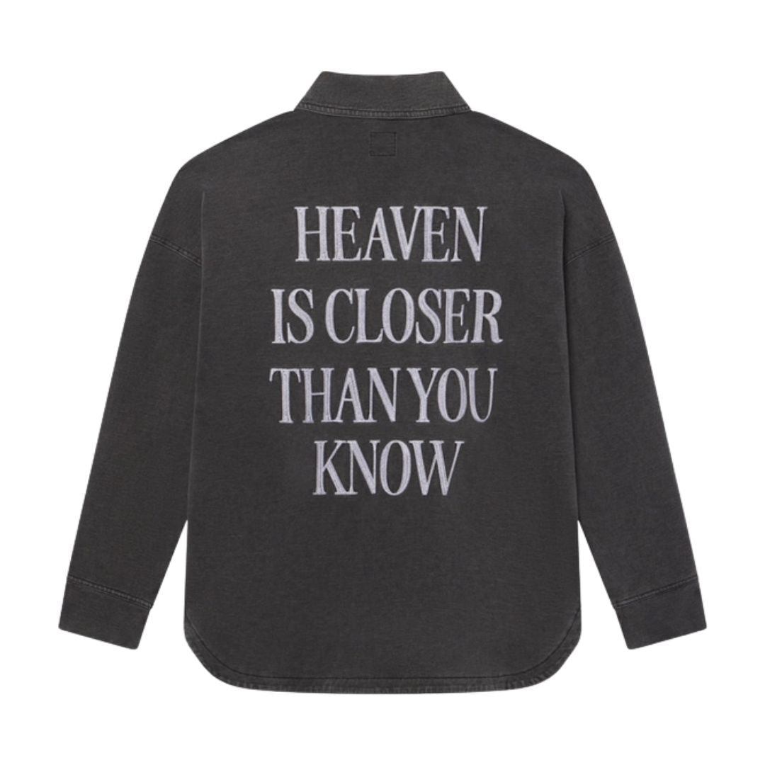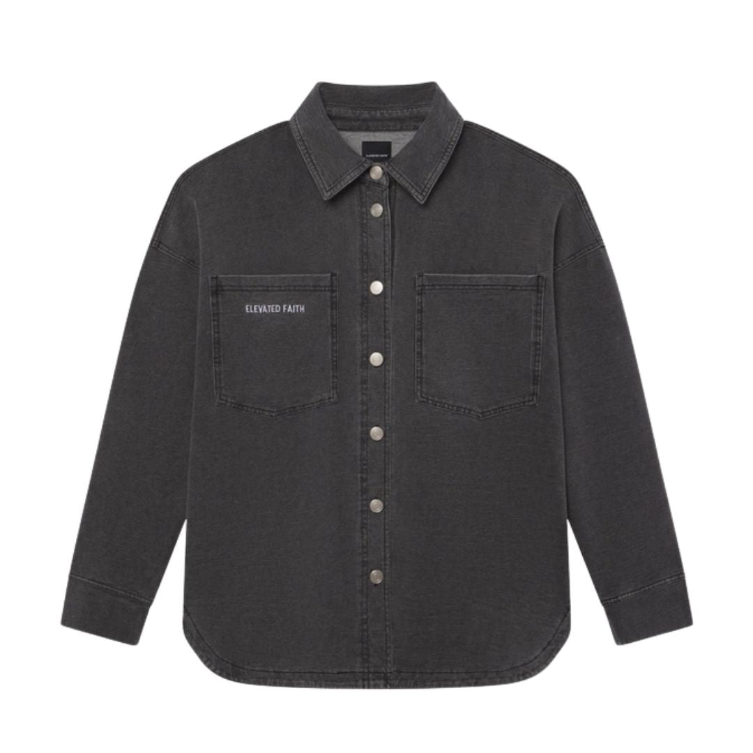 "He was afraid and said, “How awesome is this place! This is none other than the house of God; this is the gate of heaven.” -Genesis 28:17 Introducing our new shacket, a cozy combo of comfort and style. Featuring oversized patch pockets, a curved hem, and embroidery details, this layer will fit perfectly into your current wardrobe. In stretchy, distressed french terry, the shacket is as soft as your favorite EF hoodie - in a fresh, relaxed silhouette. Size: Model is 5'9" and wearing a size Small. Fit: Oversized Fit Color: Vintage Black Composition: 90% Cotton, 10% Polyester Features: Acid Wash, Soft & Stretchy Feel, Curved Hem, Patch Pockets, Embroidery Details, Button-Front Placket, French-Terry Knit