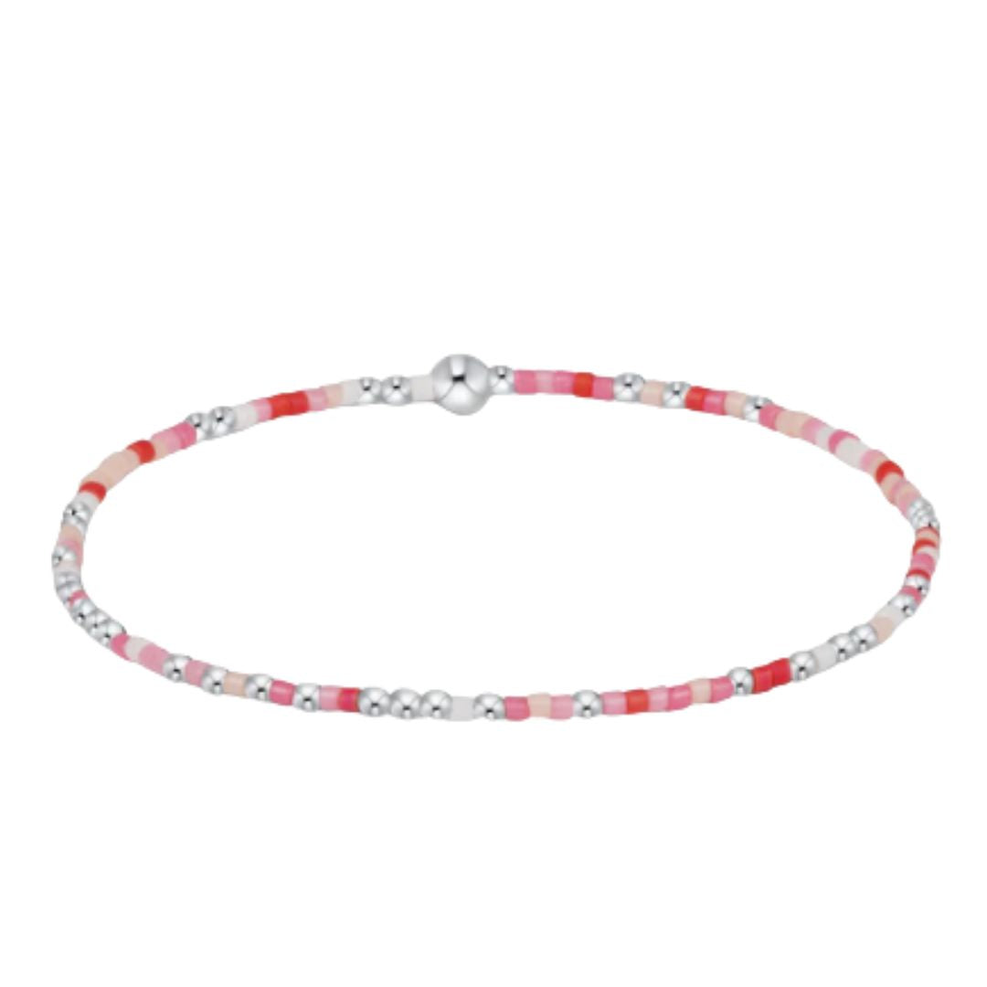 Hand beaded on high performance elastic for a slight stretch to easily roll on and off your wrist