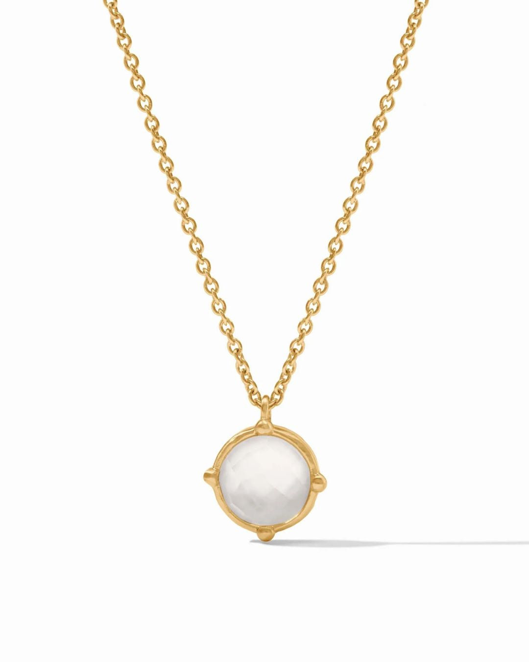 A faceted gemstone enhanced with four golden beads, dangling from a delicate cable chain.