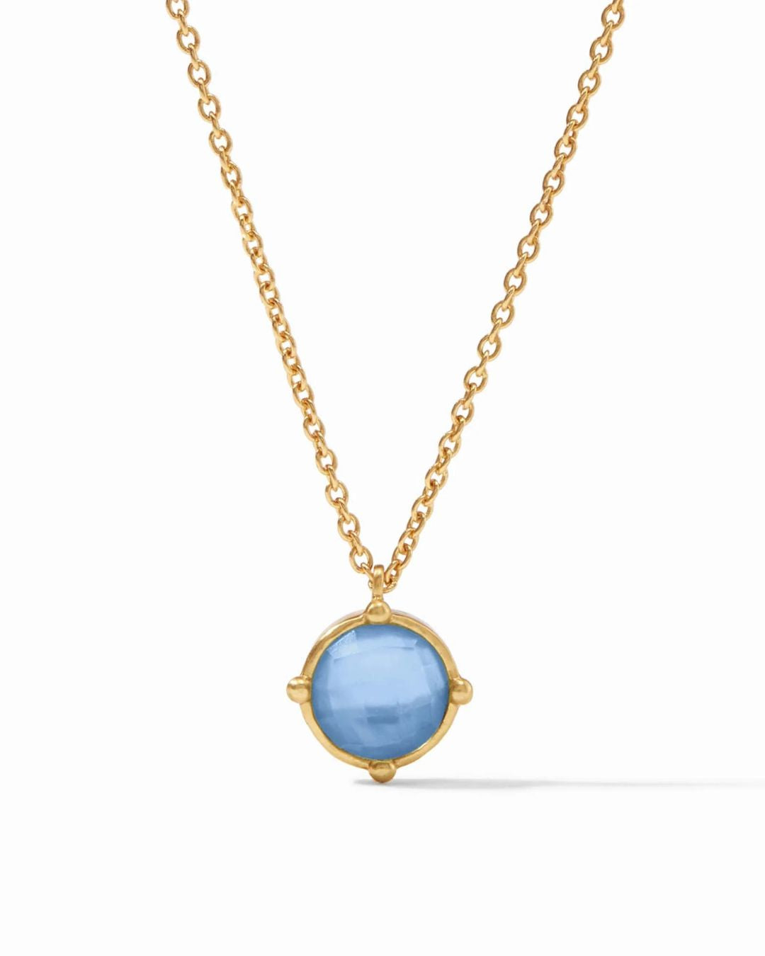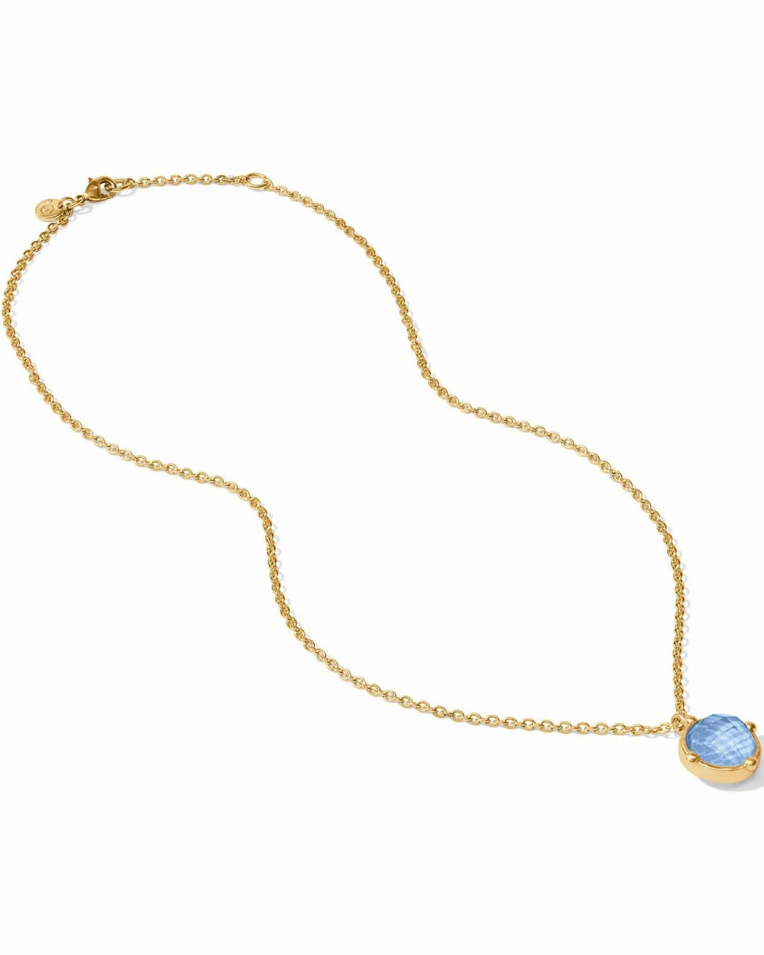 A faceted gemstone enhanced with four golden beads, dangling from a delicate cable chain.