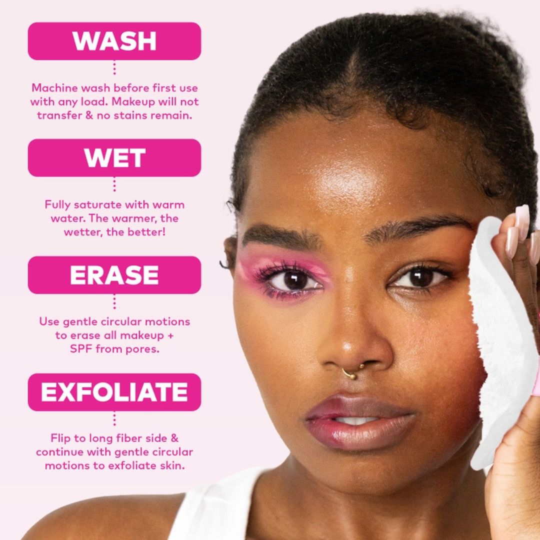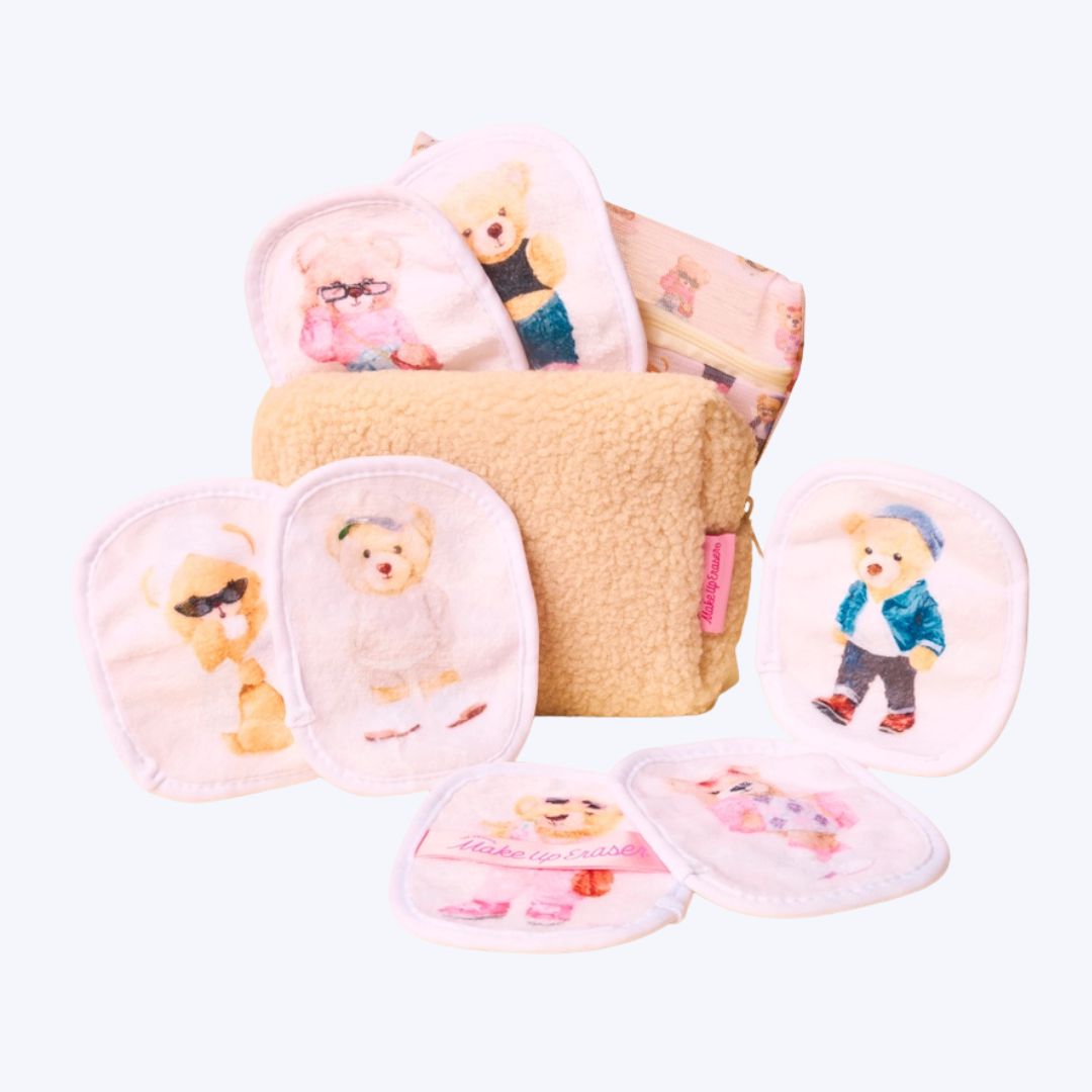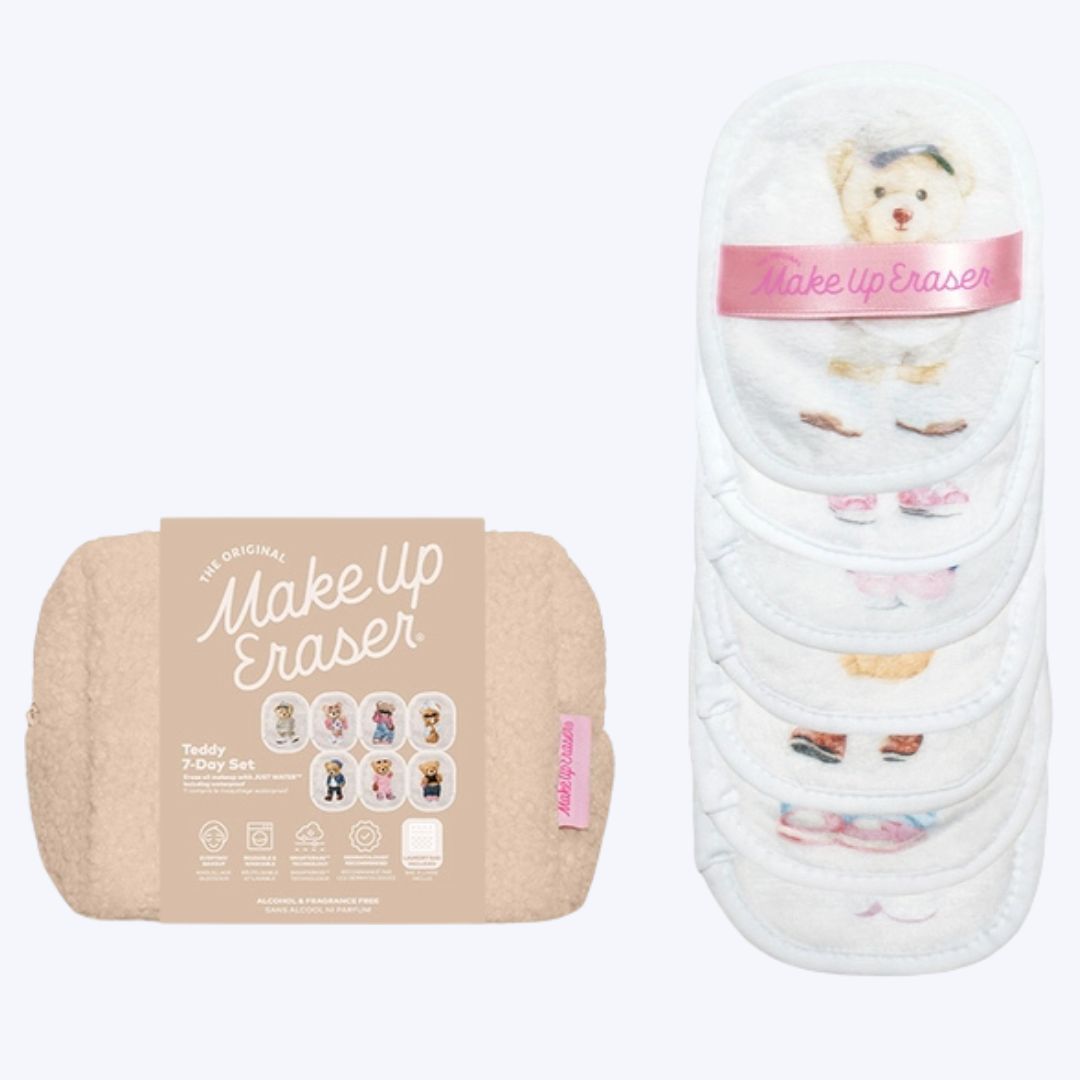 7 Cloths + Laundry Bag + (1) Toiletry Ballet Bag & PLUSH travel bag This LIMITED EDITION gift set launched just in time for the holidays. Our Teddy Bear designed sustainable MakeUp Eraser set comes with a plush makeup/toiletry bag to store all your essentials making is perfect as a stocking stuffer. MakeUp Eraser®—where tech meets clean, nostalgic, trendsetting, no waste beauty. This Makeup Remover is THE essential! Say goodbye to wasteful wipes & hello to clean beauty with the Original MakeUp Eraser®—your essential, eco-friendly face cloth that erases all makeup with JUST WATER™. From heavy foundation and SPF to lip stains and waterproof mascara, our patented SmartErase™ Technology lifts it all away—no oils, no chemicals, no waste. Crafted with millions of cloud-soft fibers, this reusable, machine-washable cloth is 2.5x more effective than traditional makeup wipes & safe for all skin types, including sensitive skin & lash extensions. One side removes makeup, while the other gently exfoliates. ✔ Dermatologist Recommended ✔ Reusable & machine washable (lasts > 300 washes) ✔ Eco-friendly: 1 cloth = 3,600 disposable wipes ✔ Tech-driven skincare ✔ Removes SPF ✔ Great for heavy or light makeup ✔ Alcohol Free & Fragrance Free How to use: Wet with warm water. The warmer, the wetter, the better! Use gentle circular motions to erase makeup with the short fiber side. Flip to long fiber side (side with tag) to exfoliate the skin. Care: Machine wash hot & dry. Dryer sheet & fabric softener safe. Machine wash before first use. What do consumers say? After 2 Week Study: 92% said skin felt more hydrated 77% saw improvement in skin texture 100% felt skin was cleaner after use