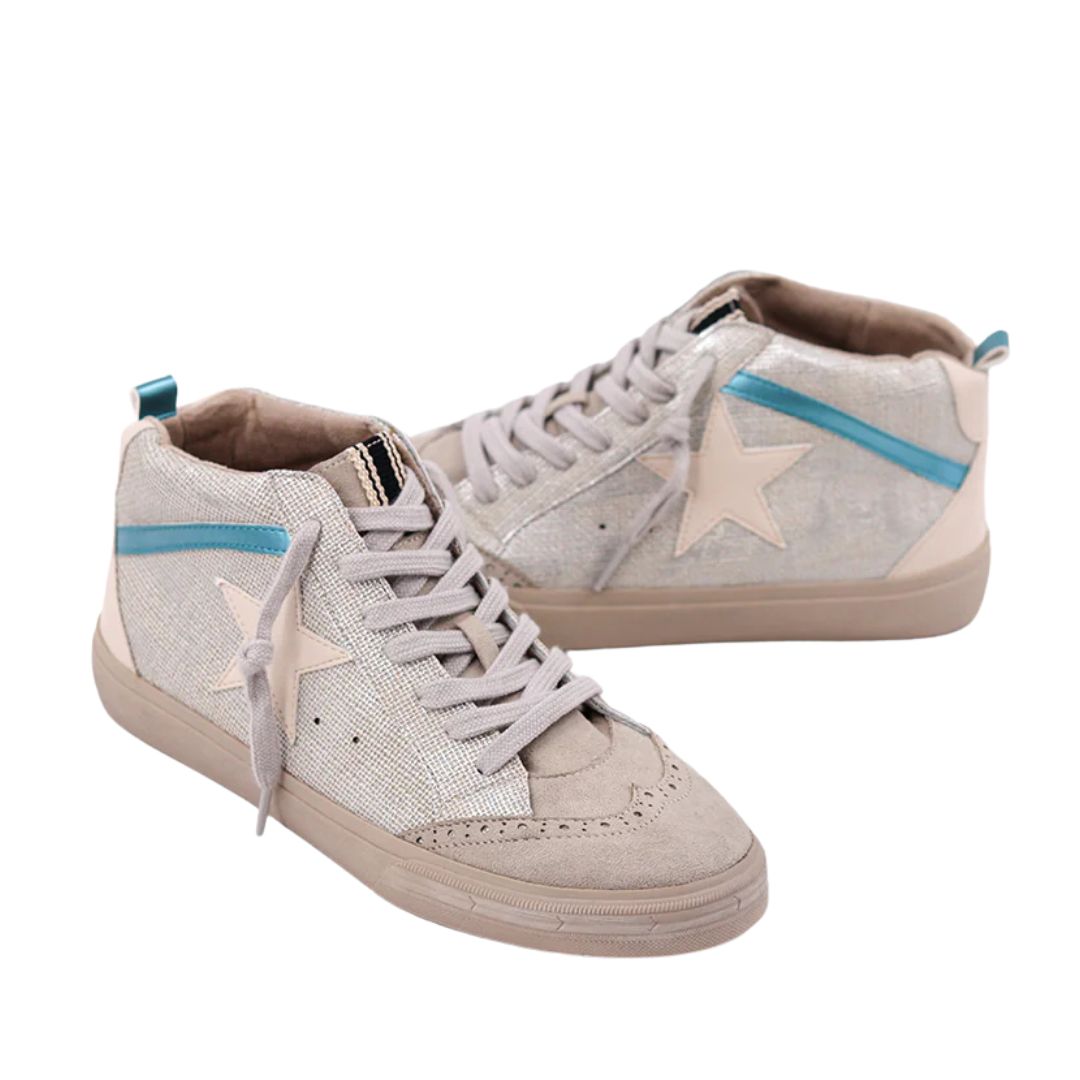 The PAULINA is a stylish mid-top sneaker designed for both comfort and fashion. This pair features a woven upper made of sterling material, complemented by faux leather and suede accents. It showcases a creamy star detail and a metallic teal stripe, adding a unique touch. With its round toe, cushioned insole, and durable sole, the PAULINA combines standout style with all-day comfort, making it perfect for elevating casual outfits.