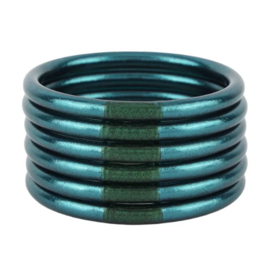 BuDhaGirl Plume All Weather Bangles® (AWB®), are the epitome of luxury in BuDhaGirl's impressive lifestyle collection. Our Plume All Weather Bangles® are a luxurious deep blue with aqua undertones reminiscent of a bird's plumage or the sultry color of an undiscovered cove. All Weather Bangles redefine elegance with their weightless, soundless, waterproof, and TSA-proof design. Crafted to perfection, each set comprises six bangles, symbolizing intentions for the day. Wear them anywhere, as their soundless and waterproof nature ensures seamless integration into any setting.