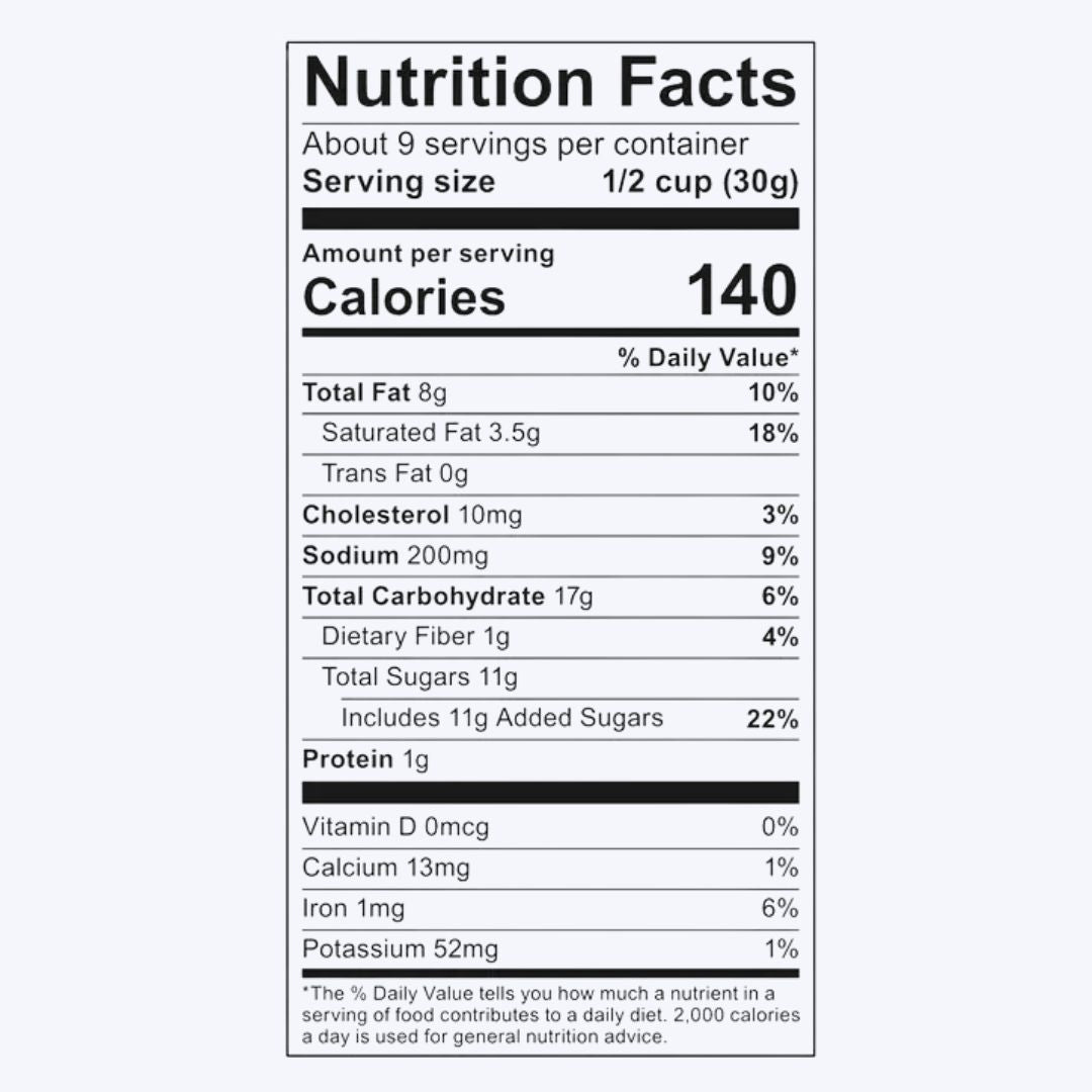 Ingredients: Brown Sugar, Popcorn, Corn Syrup, Unsalted Butter (Cream, Natural Flavor), Candied Pecans (Pecans, Maple Syrup, Salt), Almonds, Molasses , Dark Confectionery Coating (Sugar, Palm Kernel Oil, Cocoa Powder, Nonfat Dry Milk, Palm Oil, Soy Lecithin, Vanilla), Sea Salt, High Oleic Sunflower Oil, Sunflower Lecithin.