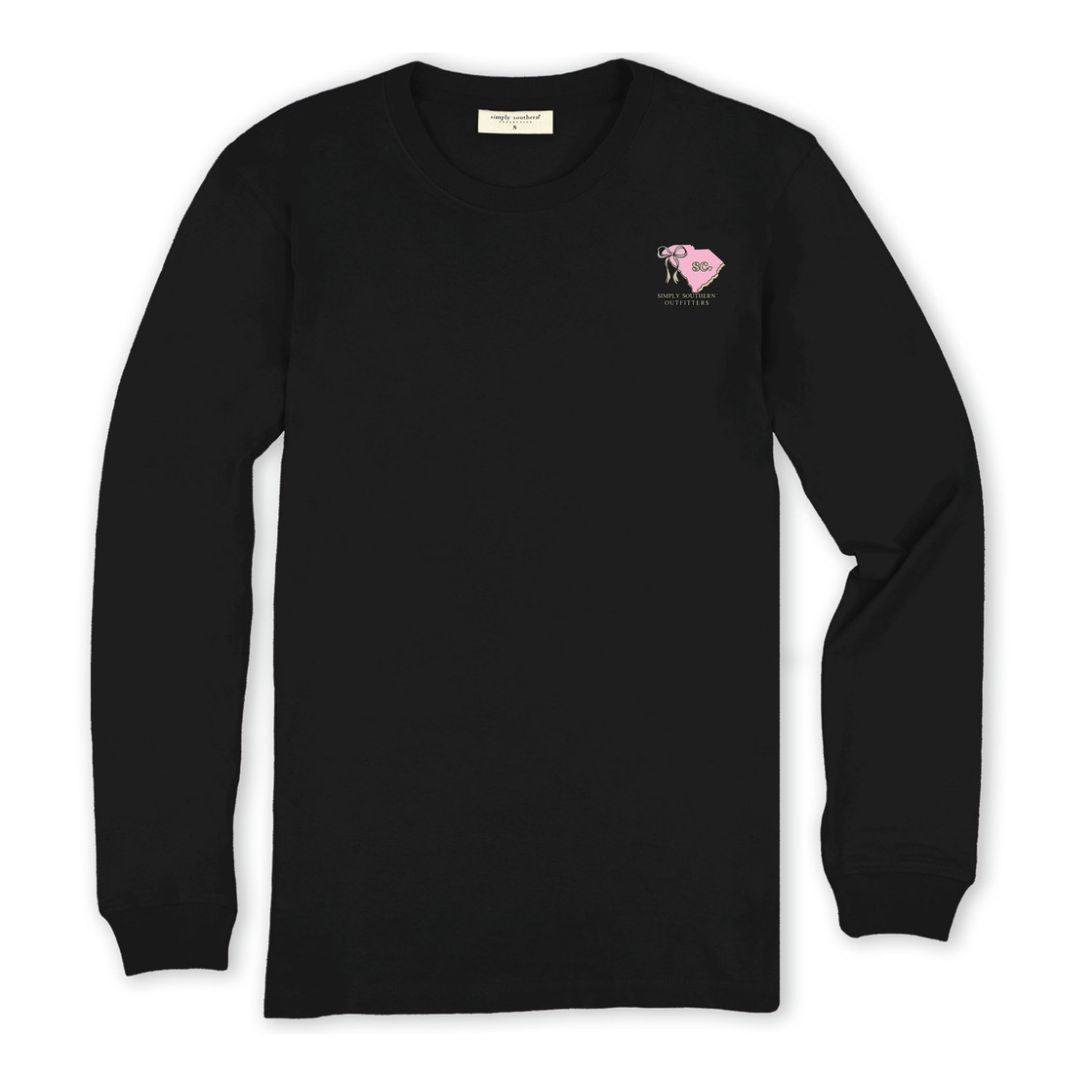 Black long sleeve shirt with the silhouette of the state of South Carolina filled with a pink camo pattern adorned with a pink ribbon and the state's abbreviation. Simply Southern logo below. Similar design on left chest. Camo hair bows along right sleeve. 100% cotton. Unisex sizing.