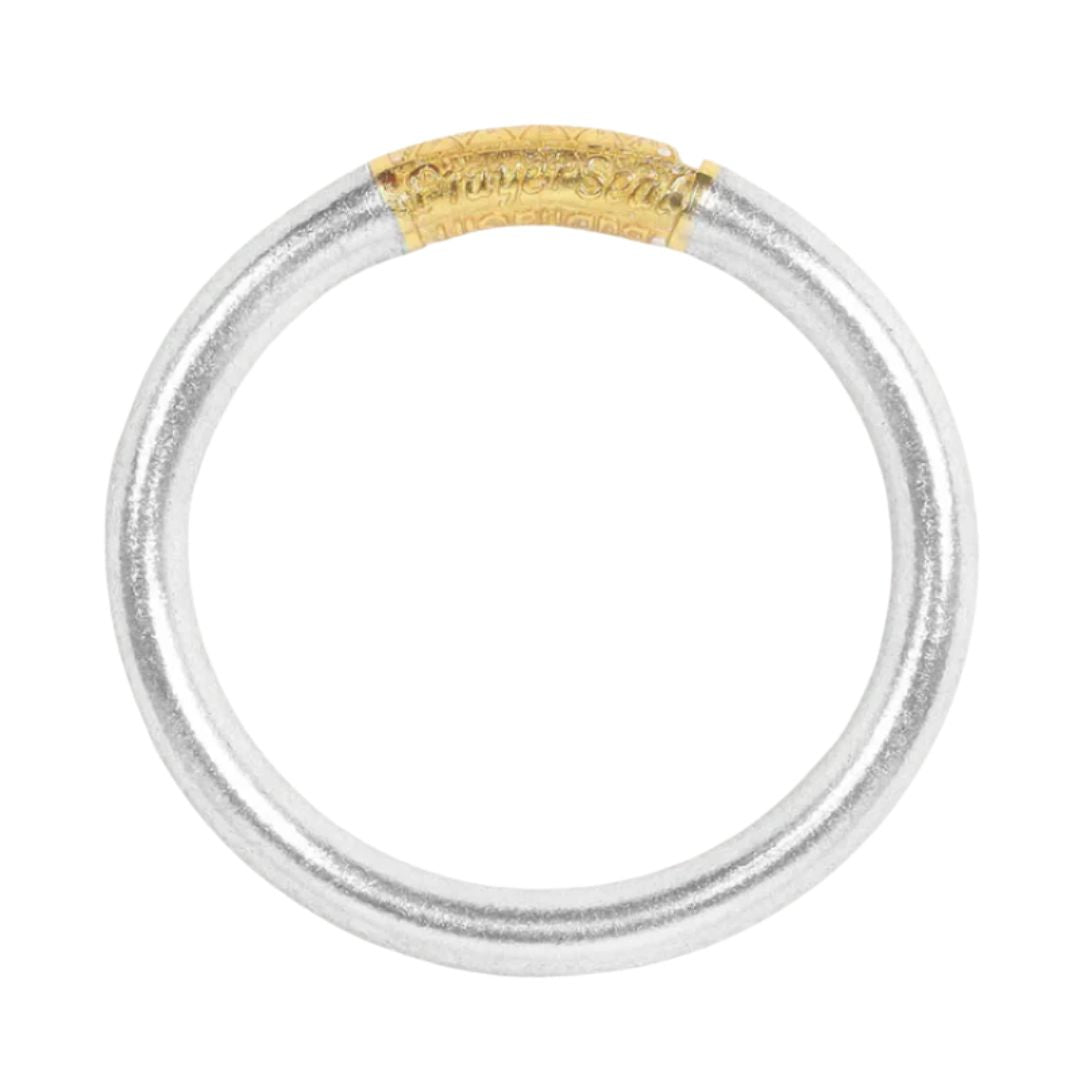 Handcrafted in Thailand by exceptionally skilled artisans, each Tzubbie Silver All Weather Bangle is meticulously crafted by a team of 20+ artisans, making each bangle a labor of love. Utilizing organic materials, slight color variations may naturally occur due to humidity and temperature conditions. Over time, the uncoated brass of our Serenity Prayer Bead may develop a verdigris patina, adding to its charm. The essence of the Tzubbie Silver All Weather Bangle lies in its ability to age gracefully, acquiring character while retaining its inherent beauty—much like the remarkable women who wear them.