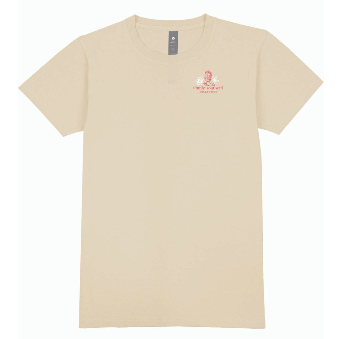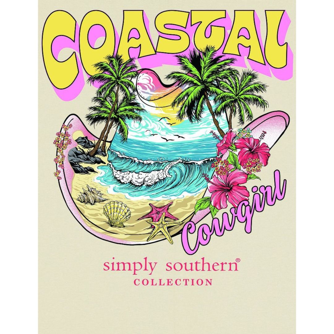 Wisp tan short sleeve shirt with the phrase 'Coastal cowgirl', a cowgirl hat with beach, palm trees, and hibiscus flowers. Simply Southern logo below. Cowgirl boots and hibiscus flowers on left chest with Simply Southern logo below. 100% cotton. Unisex sizing.