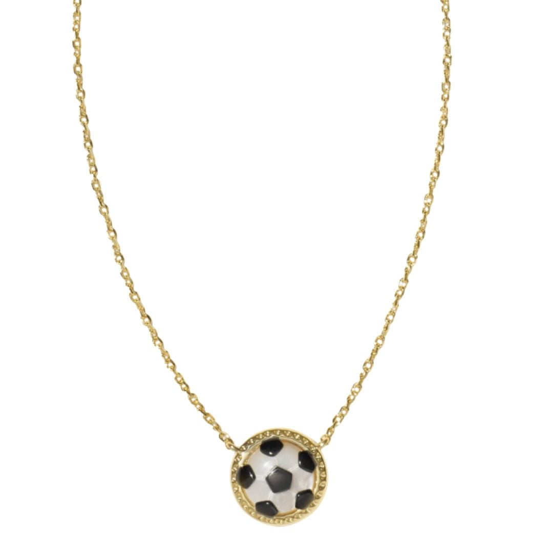 Score major style points when you wear the Soccer Gold Short Pendant Necklace in Ivory Mother-of-Pearl. A shimmering soccer ball pendant complete with gunmetal detailing, this sporty style brings the spirit to every game.