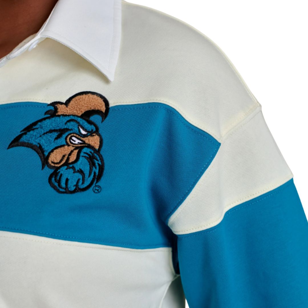 This long sleeve rugby top blends nostalgic charm with modern details. Designed in breathable French terry, it features a boxy, relaxed shape with dropped shoulders, a functional placket, and tonal chenille embroidery across the chest and back. We’re styling it with bermuda shorts or relaxed, baggy jeans and ballet flats for a sporty-meets-stylish look.