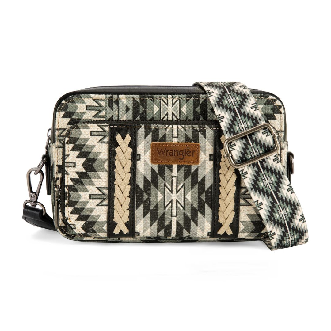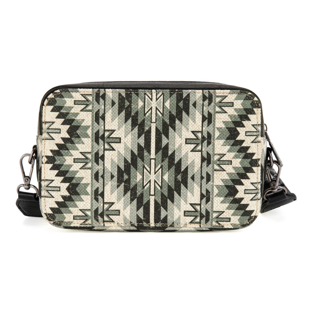 - Detachable Aztec print canvas crossbody strap,